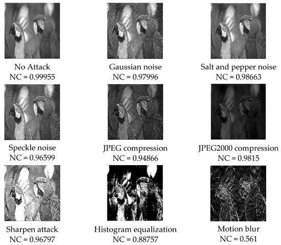 Figure 12 shows the secret image extracted from the attacked steganography image when the cover image is a Lena. The extracted secret image is lost in information, but the extracted secret image under most attacks is still acceptable in human vision, and a large amount of information can be obtained from the extracted secret image. Except for the motion blur attack and histogram attack, the normalized correlation values of all extracted secret images are above 0.93. For noise attacks, the normalized correlations of Gaussian noise, salt and pepper noise, and speckle noise are 0.97996, 0.98663, and 0.96599, respectively; for compression attacks, the normalized correlations of JPEG compression and JPEG2000 compression are 0.94866 and 0.9815, respectively; for sharpening qttack, the normalized correlation is 0.96797; for histogram equalization, the normalized correlation is 0.88757; for the motion blur attack, the normalized correlation is 0.561.
