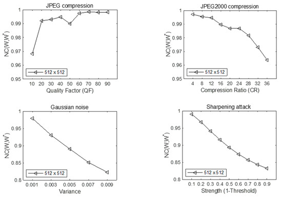 The normalization coefficient (NC) is used to evaluate the integrity of the secret image extracted from the attacked image to verify the robustness of the proposed scheme.