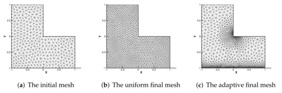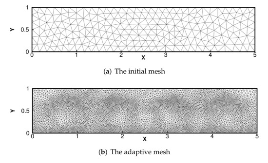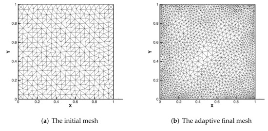 According to in Figure 2c, we can see that near the singular point of u and the line of with the singularity of p, mesh refinement is carried out effectively, and the desired results are obtained, which shows that the adaptive mesh refinement is effective.