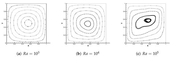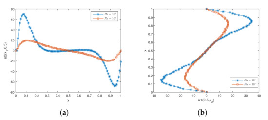 Figure 4 shows the initial mesh and the adaptive encryption result grid. Figure 5 and Figure 6 are the velocity streamline and isothermal chart for different Rayleigh numbers: and . Figure 7 and Figure 8 present the results of the streamline of the velocity and the isotherm diagram calculated without the defect-correction method at different numbers, and it can be seen that as increases, the calculated results become more unstable [38]. In Figure 9, we also show the vertical velocity distribution at and the horizontal velocity distribution at , which are very popular graphical illustrations in experimental studies of thermally driven cavities. We see that the profiles increasingly vary as the Rayleigh number increases, which is consistent with previous studies [5,7,39].