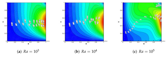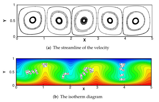 The results of numerical streamlines and numerical temperature are shown in Figure 11 and Figure 12 with , and . The results coincide with the phenomenon described in the literature [38], indicating that our adaptive DCM is suitable.
