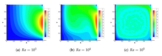 Combined with previous research results, the dimensionless parameter (Rayleigh number) plays an important role in NC equations. It is well known that the buoyancy force is the driving force of NC equations, where the buoyancy force is the density difference caused by the temperature difference. The Rayleigh number represents the ratio of the buoyancy force to the viscous force, which characterizes the relative strength of the buoyancy-driven inertial force to that of the viscous force [20,21]. When , the buoyancy force is much larger than the viscous force, and the convection caused by the buoyancy force is significant, which leads to the convection dominance problem [22]. Therefore, there are a number of effective numerical techniques dedicated to solving this difficulty: the variational multiscale method in [23], the defect-correction method in [24,25,26,27], etc. Among them, defect correction is one of the commonly used methods to address large number problems.