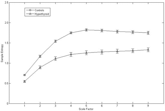 Hyperthyroid patients have an impaired heart rate dynamical system, as evidenced by previous HRV studies [,,]. Up to the present, there has not been a study in using MSE analysis to investigate the heart rate dynamical system in patients with hyperthyroidism. The study objective was to use MSE analysis to compare the system complexity of heart rate dynamics between the hyperthyroid patients and the control subjects. We hypothesized that the system complexity of heart rate dynamics is reduced in the hyperthyroid patients.