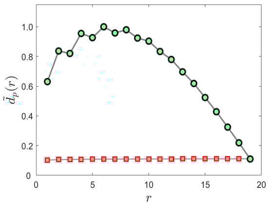 The performance of the proposed maximum intelligibility symbolization algorithm is shown in this example. The lower red curve shows the intelligibility of regular symbolization, while the upper green curve shows the intelligibility of the proposed algorithm as a function of probabilistic symbol rank. In this case the alphabet size is M = 20.