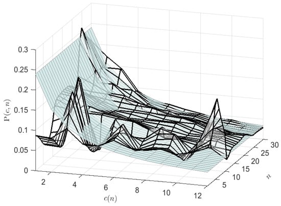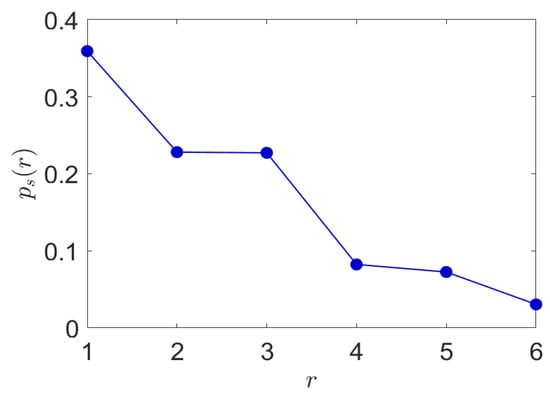 The CDF-ZML symbolization algorithm with a synthetic alphabet size of  was applied to 10 s of meerkat behavioral data. A ZML distribution was generated according to (A1)–(A9). The symbolic pdf output is shown in Figure 9.