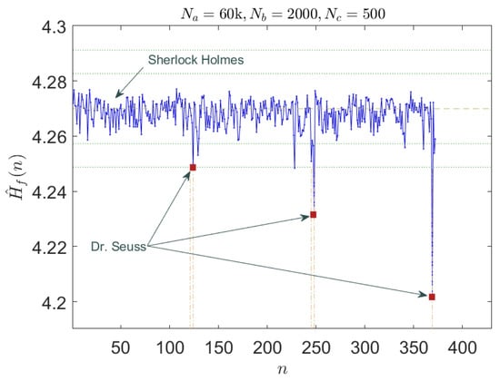 In this case, the initial dataset consisted of the text from “The Adventures of Sherlock Holmes”, which is a collection of twelve short stories by Arthur Conan Doyle, published in 1892. This main text was interspersed with short segments from a classic children’s story, “Green Eggs and Ham” by Dr. Seuss published in 1960. The full texts were symbolized and the entropy was estimated using the efficient algorithm described in [], applied to non-overlapping windows of 500 symbols in length.