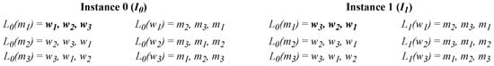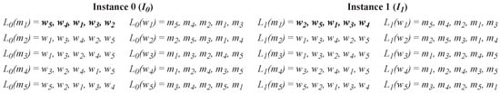 Dynamic preferences result in a more realistic scenario for a stable matching problem in which agents do not always express their preferences correctly due to a lack of observations or information about their opposite side. In the classical SMP, an instance is defined as , where M and W denote the sets of male and female agents, respectively; L denotes the order of each agent’s preference list for the opposite side. The preference list of a male agent m can be written as L(m). However, in the case of the SMP with dynamic preferences, multiple SMP instances may exist as a result of changes in one or more agents’ preferences. In other words, the number of possible instances that will occur is , where k denotes the number of preferences expressed by each agent, and n is the size of the SMP. The dynamic instance set is . For example, if there is a single agent with two distinct preferences in size n of the SMP, there will be two SMP instances available. In the dynamic preference model, changes in an agent’s preferences are a permutation of their previous preference list. This means that no new members will be added or removed from an agent’s preference list during the preference changes.
