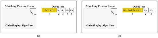 The stable matching of instance 0 is = {}. Now, we want to find the stable matching of instance 1 by updating . Comparing and , it is known that the pair will become a blocking pair in matching if we use as the preference. blocks and in matching . By using Theorem 2, we allow the removal of the pair . Removing from instance 1 will produce the reduced matching = {}, which is stable with respect to the reduced SMP instance (). As illustrated in Figure 4b, members of may immediately enter the room together. Meanwhile, the removed pair forms a queue outside the room.