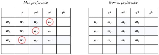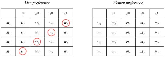 The stable marriage problem (SMP) was introduced by Gale and Shapley []. An SMP is a two-sided matching problem with an equal number of agents on each side. Each agent expresses a strict order preference that includes all members of the opposite side. The goal of the Gale–Shapley algorithm is to find a stable matching for all involved agents. The term “matching” refers to the process of pairing or matching participants (groups of men and women) in order to satisfy a specified criterion. A matching process is a step to determine the pairs of participants (sets of men and women) to meet the specified criteria. The size n of the SMP instance is , where M denotes the set of male agents , W denotes the set of female agents , and L represents a list of the preference order of an agent for the opposite sex. To express the preference order list of agent , we can denote it by . For such an instance, a matching is a one–one correspondence between the men and the women. If a man m and a woman w are matched in , they are referred to as partners, and we write and . is the partner of w in , and is the partner of m in . In the SMP, the stability of matching is determined by the existence of a blocking pair. In a matching , a pair is said to be a blocking pair if m and w are not a pair in , but m prefers w over and w prefers m over . That is, . A matching that contains at least one blocking pair is called unstable; otherwise, it is stable.