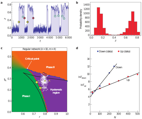 The importance of microscopic modelling. A simulation of a model with spontaneous recovery from failure on a regular network with k = 10 made of 100 nodes. (a) A realization of the time evolution starting from point A in panel (c) with switching between the failed and active states marked by yellow circles, and failure to complete a transition by green circles along the time series. (b) The probability density function of (a). (c) The phase space for the specified system, with the while line showing the path realized in (a), yellow and red circles matching the above. (d) The expected life time of the system in each state given a network size. After [55].