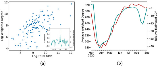 In Ref. [63], the authors start from the microscopic mobility patterns of individuals and construct a country-wide network of mobility in Italy, before, during and after the first lockdown. Various parameters of the emerging networks are analyzed, from the perspectives of scaling, dynamics and resilience. Interestingly, strong relations are found with two major economic indicators. Statically, i.e., using a historical point in time, regional mobility levels correlate strongly with official levels of regional GDP. Further, using a fast-moving estimate of the GDP based on several measures (and on its own shown to match the actual GDP when available), they show how well changes in levels of mobility correspond to changes of GDP, and from that they derive the local (regional) estimates of GDP (Figure 5), in near-real time, by far faster than official calculations. This estimate, easily calculated from available data, could allow decision makers to gauge the magnitude of economic impact to various regions following planned restrictions. Thus, again, a microscopic model gives macroscopic visibility into system behaviour and stability.