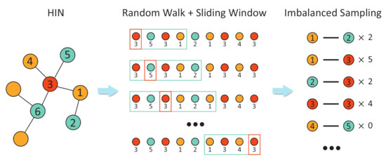 The network representation approach relies on the quality of samples taken, which is supposed to be balanced, and hence accurately reflects the proximity between nodes. However, nodes with high centrality, such as the hub node, are likely to appear more frequently in the trajectory of the random walker. Therefore, the traditional framework by the random walk and the sliding window is likely to generate less balanced network samples, which, in turn, negatively affects the embedding results. First, if the target node is a node with high centrality, it may appear repeatedly in the sliding window, yielding self-pairs that start and end on the same node (node 1 in Figure 1). The self-pairs will introduce redundant information and semantic inaccuracies [22]. Second, other nodes may be associated with the high centrality node too often. For example, node 2 and node 3 in Figure 1 are both neighbors of node 1. However, because node 3’s degree is much higher, it would form more node pairs with node 1. Therefore, the learning algorithm is likely to assume that node 1 is closer to node 3 than node 2, although their topological separations are the same. These two issues are most prominent in HIN, whose multipartite graph structure is sustained by connections between different types of nodes. Such a structure effectively generates a lot of stars, in which a hub node connects multiple low-degree nodes, giving rise to a high abundance of hub nodes in a fixed sliding window.