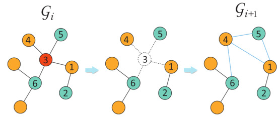 Denote by a set of node types. For all node pairs sampled by SAS on , we focused on pairs whose context node falls into node type . We ranked the appearance of these context nodes, obtaining a set of the top-k nodes with the largest appearance, denoted by R. A hyper-parameter a was used to determine the percentage of cutoff for the top-k nodes. We then constructed a coarsened graph in which nodes in R are removed and the neighbors of each removed node are randomly rewired. In particular, for each node v in R, we found its neighbors . For every node in , we connected this node with another random node in to approximatively preserve local communities. The procedure is illustrated in Figure 2.