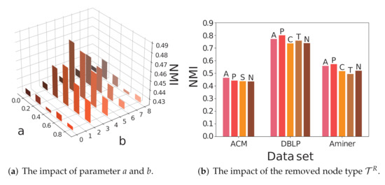 a controls the ratio of each coarsening step, and b controls the times of the coarsening step. We depict the results of community detection on the ACM data set by different values of a and b in Figure 3a. When no coarsening is taken ( or ), the performance is roughly the same as or slightly better than other baseline methods. The performance is improved when one round of network coarsening is taken and peaks when and . Then, the performances decrease as a and b continue growing, which is due to the fact that the over-coarsening encourages more sampling on the original HIN, weakening the contributions of the sampling on coarsened networks.