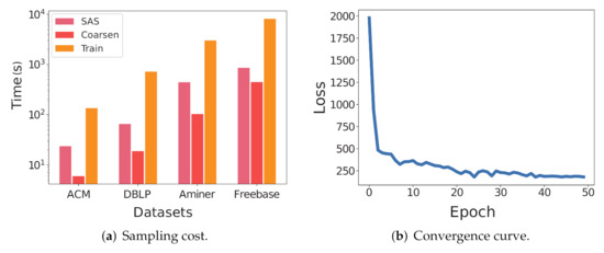 Scalability.Figure 4a shows the sampling costs of the SAS, coarsening, and training step of CoarSAS2hvec on each data set. The result shows that the computational complexity of SAS is roughly linear to of the network. The computational complexity of coarsening and training steps are linear to of the network. This conclusion is consistent with the foregoing complexity analysis. Considering Deepwalk [8] as a reference, the computational complexity of its sampling step is and the computational complexity of its training step is .