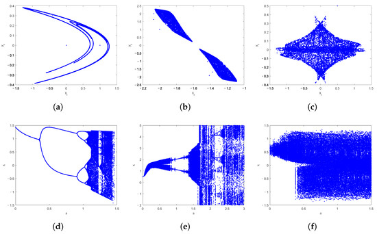 The phase portraits and bifurcation diagrams. Phase portraits: (a) 2D-CHM with , (b) 2D-SM with , (c) IHM with , ; bifurcation diagrams: (d) the 2D-CHM with , (e) 2D-SM with , (f) IHM with , .