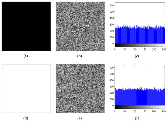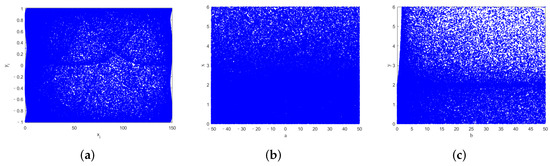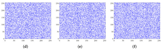 As observed in Figure 1a–c and Figure 2a, the attractor structures of the 2D-CHM, 2D-SM, IHM, and 2D-ICHM are different. The attractor of 2D-ICHM is a noiselike pattern. It indicates that 2D-ICHM has better ergodicity. As can be seen from Figure 1d–f and Figure 2b,c, the bifurcation diagrams of the x and y components of the 2D-ICHM are also noiselike patterns, where the control parameters and . It indicates that 2D-ICHM has a larger parameter space and continuous chaotic range. Taken together, 2D-ICHM has a more complex chaotic behavior and is suitable for image encryption systems.