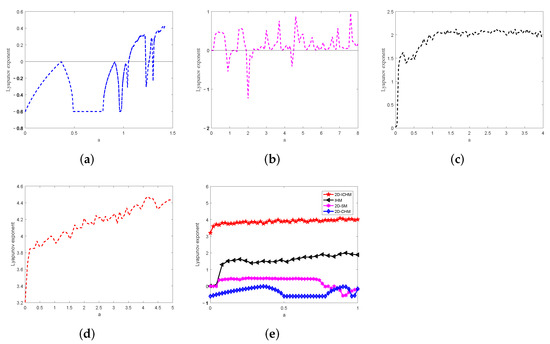 The LEs of 2D-CHM, 2D-SM, IHM, and 2D-ICHM are calculated by QR decomposition algorithm, and Figure 3 plots their largest LEs. The figures are obtained by changing the parameter a when other parameters are fixed. A comparison on the largest LEs of the above four chaotic systems is given in Figure 3e. It is noted from this that 2D-ICHM has a larger and continuous positive LE value. Thus, 2D-ICHM has a more continuous chaotic range, which means it is suitable for image encryption systems.