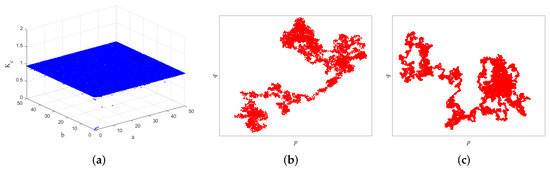 Figure 5 shows the 0–1 test results of 2D-ICHM with , and initial values . As shown in Figure 5a, is very close to 1, illustrating that the 2D-ICHM has significant chaotic behavior. In addition, The plane also can intuitively reflect whether the dynamic system is chaotic or not. When the trajectory of the plane is bounded motion, the dynamical system is regular, and when the trajectory of the plane is Brownian-like motion, the dynamical system is chaotic. The planes of the 2D-ICHM are shown in Figure 5b,c. It can be seen that the trajectories of 2D-ICHM are similar to Brownian motion. This means that the 2D-ICHM is a chaotic dynamic system.