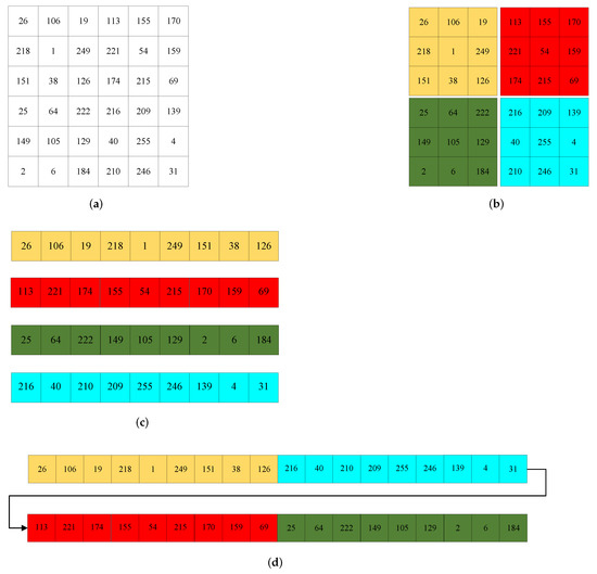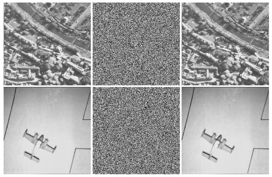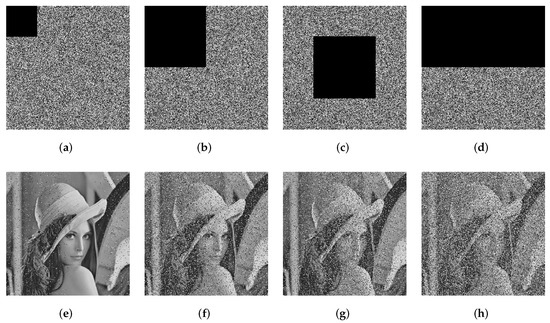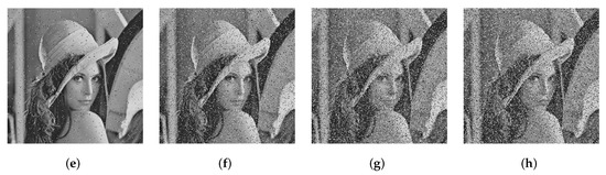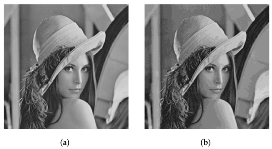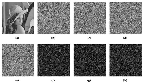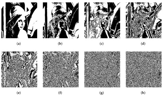 Figure 6a is a grayscale image “Lena” of size 256 × 256. The eight binary planes of “Lena” are shown in Figure 7a–h. The higher bit plane contains more information, among which the high four bit planes contain more than of information in the original image [46]. A composite image of high four bit planes is shown in Figure 6b, which retains the vast majority of the original image.