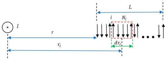 where is the length of the “ith” sub-string, is the number of spins in the “ith” sub-string , and (in the Stirling approximation) is the constant. It is latently adopted that a sub-string contains a “large” number of spins, enabling the statistical approach; for details, see [16,17], in which the field of validity of Equation (5) is carefully addressed. The total entropy S of the string of spins exerted to the magnetic field generated by the infinite straight direct current I, depicted in Figure 1, is given by Equation (6):
