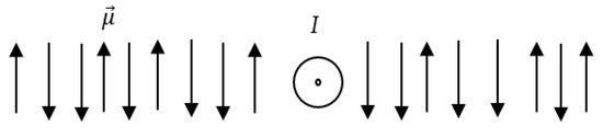 The eventual Equation (11) deserves the discussion. First of all, it should be emphasized that the derived magnetic force is always the repulsion force; this is intuitively a well-expected prediction. Indeed, whatever is the location of string, the magnetic field always decreases the entropy of the entire string, under ordering of the elementary magnets, which is recognized from Equations (5)–(7), which is thermodynamically unfavorable under isothermal conditions. In addition, the repulsion nature of the entropy magnetic force is independent on the direction of the current I, as it is immediately seen from Equations (9) and (11). This result supplies an important prediction: consider the direct current embedded into the continuous medium built of the elementary magnets , as shown in Figure 2. The magnetic entropic force will repulse elementary magnets, wherever they are located. Thus, in the continuous medium comprising elementary magnets/spins, the phenomenon of the “entropic pressure” stimulated by the external source of the magnetic field (current) is predicted. Recall that the isothermal pressure of an ideal gas is also a pure entropic phenomenon. The entropic force supplied by Equations (9) and (11) will appear for both diamagnetic and paramagnetic materials, seen as ensembles of elementary magnets.