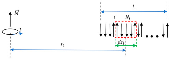Consider the linear (1D) string of elementary non-interacting magnets (spins) exerted to the magnetic field generated by a straight, infinite, direct current located, as depicted in Figure 1.