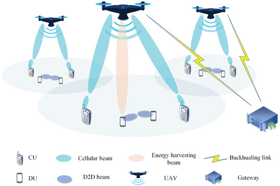 Recently, UAV-assisted communication-network-supporting energy transfer has gained significant attention. With the advantages of flexible deployment and low-cost deployment, UAVs can quickly establish A2G links and transmit information and energy to ground users [1,2]. UAVs have been widely used in emergency communications to quickly restore ground equipment communications in disaster-stricken areas or improve the quality of service for degraded users in overloaded ground areas. UAV Base Stations (UAV-BSs) equipped with large-scale antenna arrays can provide directional transmission of information and energy, thereby avoiding interference between UAVs caused by strong Line-of-Sight (LoS) paths.