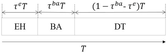 In our paper, we did not focus on the energy consumption of the UAVs, since they have a larger battery capacity and can be charged by a charging station. In our scenario, we incorporated EH technology into the system and assumed that each DT can harvest energy from the ambient RF signals to prolong the transmission time. We assumed that the A2G links, including signal and interfering signals, are utilized by the DTs to harvest energy and restore the energy of the battery. As shown in Figure 2, we adopted the EH-BA-DT protocol for D2D links, where the total transmission time for with duration T is divided into three phases: (1) energy harvest phase with a duration of : DTs harvest the energy from the ambient environment and store it in the battery; (2) beam alignment phase with a duration of , during which the DUs perform beamwidth alignment for the transmitter and receiver; (3) data transmission phase with a duration of : after EH and BA, the DT starts transmitting data to its associated DR, where is the unified time ratio of EH for all the DUs, and is the time ratio of BA for , respectively.