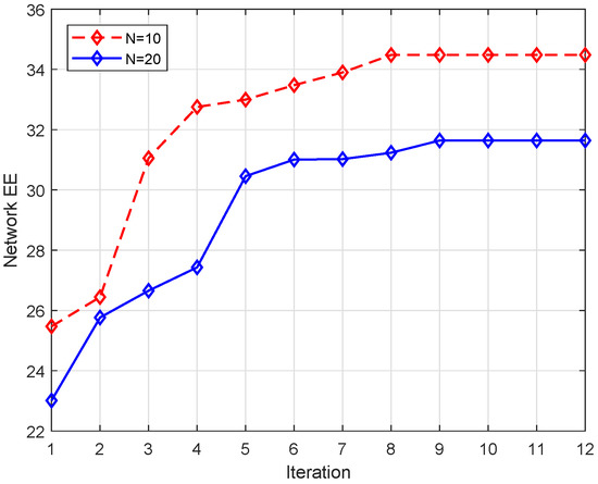 In Figure 5, we fix and plot the network EE versus the number of D2D links, comparing the proposed algorithm with the benchmark schemes under different N. It can be seen that the proposed algorithm can achieve better performance than FBFP and a performance near PSO and ES. The beamwidth selection and power control in our algorithm were designed to improve the network EE, and the EH time ratio optimization could further increase the EE. Another observation is that the network EE decreased with N. The reason lied in that although the narrow beams were adopted for the DUs, more D2D transmitters would potentially increase the interference between the DUs, thus degrading the transmission rate of the DUs, which degrades the network EE. A similar observation can be found by comparing the EE of the JOETRB [10] and FBFP algorithms under different N. However, it can be seen that the EE for the JOETRB [10] and FBFP sharply decreased when N exceeded 15, while our proposed algorithm still maintained a good level thanks to the dynamic adjustment of the beamwidths, power levels, and EH time ratio for the DUs.