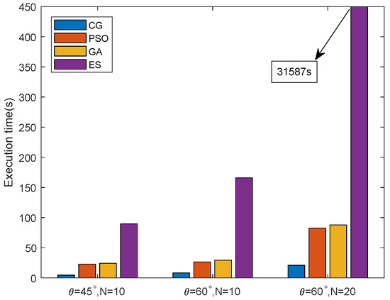 In Table 2, we list the time complexity of the posed CG, PSO, GA and ES, where and denote the population size for PSO and Ga, and denote the maximum number of iterations to converge for PSO and GA. It can be seen that the proposed CG greatly reduced the complexity compared with ES, which had exponential complexity. Generally speaking, the execution of PSO and the GA required a large population and number iterations to converge. Therefore, the complexity of the proposed CG also outperformed PSO and the GA.