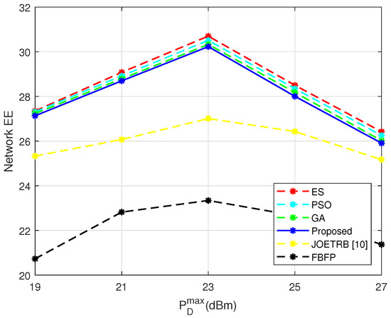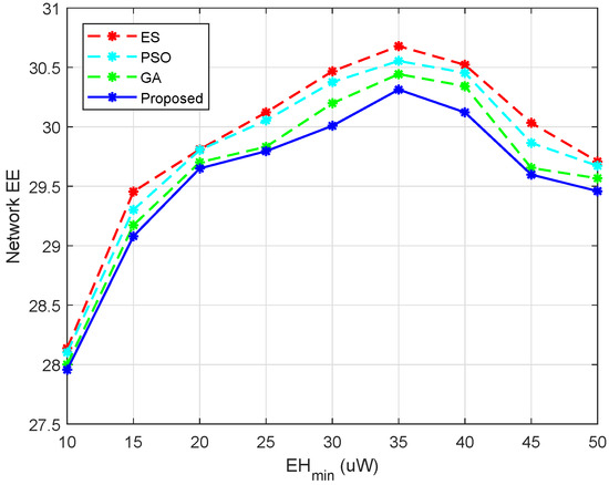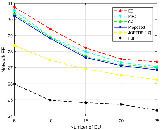 In Figure 8, we evaluate the effect of on the network EE. As increased, the network EE gradually increased, which can be seen from the curves of the proposed algorithm, PSO, and ES. However, with the further growing of , the network EE no longer had unlimited growth. The reason was that the increased required the DUs to harvest more energy, so the DUs were more inclined to increase the power and increase the EH time ratio . However, the EE will not monotonically increase with the EH time ratio, because with more energy harvested, less energy will be consumed and the user rate will decrease at the same time due to the reduction of the effective transmission time. Moreover, due to the existence of the , the power of the DUs was also limited. It can be seen that the proposed algorithm could achieve a performance close to PSO, the GA, and ES.