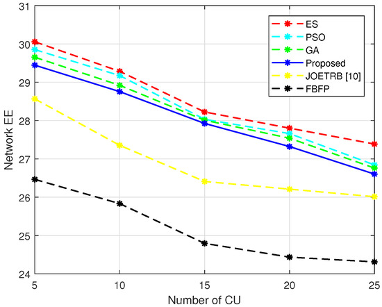 In Figure 6, we plot the network EE versus different numbers of CUs to compare the performance of the proposed algorithm with ES and FBFP under different M. It can be seen from the figure that the energy efficiency of the proposed algorithm and the benchmark schemes decreased with the increase of M. The reason was that the growing of M led to the increased interference from the CU, i.e., . At the same time, in order to meet the minimum rate constraint for the CUs, the DUs had to strictly control the transmit power, which degraded the transmission rate for the DUs. Although the growth in the number of CUs provided more energy for the DUs to harvest, it also led to the decrease of the user rate, which significantly impacted the EE. Therefore, in a heterogeneous network where CUs and DUs coexist and share the spectrum resources, the EE performance of the DUs will be degraded when the number of CUs increases. It can be seen from the figure that the performance of the proposed algorithm still approached PSO, the GA, and ES and outperformed the JOETRB [10] and FBFP strategies, which further verified the effectiveness of the proposed algorithm.