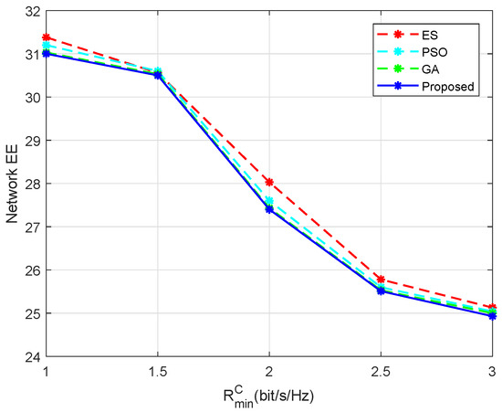 In Figure 9, we plot the network EE under different . As increased, the EE of all three algorithms decreased. The reason was that when increased, the DUs had to decrease their transmission power to reduce the interference to the CUs, so as to meet the rate requirement of the CUs. By comparing the performance of the three algorithms, a similar conclusion can be drawn that the proposed algorithm can achieve a close performance to PSO, the GA, and ES.