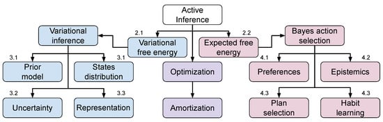 Understanding the processes that sentient and reasoning beings play out mentally in order to perceive the world they live and act in is as compelling as it is complex. The free energy principle hypothesizes all brain processes can be understood as subserving one unicum imperative: the minimization of free energy [,]. This principle, and its corollary active inference, assumes that agents act to contrast forces from the environment that obstruct them from remaining in a restricted set of preferred states of the world. Under this assumption, biological agents develop a variety of skills, such as perception, action, planning, and learning, that agents continuously adapt along their lives.