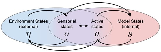 In Figure 2, we illustrate the interplay between the main factors that determine the embodied perception process as described in active inference. At any time, the environment is in a certain state , which is external to the agent and not directly observable. The agent interacts with the environment in two ways: either through (passive) sensorial perception, which is characterized by the observation of sensorial states o, or by actions, which can be cast as a set of active states a that the agent imposes on the environment. According to the free energy principle, in order to minimize free energy, the agent learns an internal model of potential states of the environment. Crucially, these internal states do not need to be isomorphic to the external ones, as their purpose is explaining sensorial states in accordance with active states, rather than replicating the exact dynamics of the environment Isomorphism, in this context, refers to considering a structure-preserving mapping of the state space. According to active inference, internal and environment states are not necessarily equal and the way the internal states are organized may even differ from agent to agent, despite having to deal with similar concepts/observations/sensory states. From a biological perspective, this finds evidence in the fact that different living systems have developed different organs/tissues along their evolutionary process []. The role of the internal state representation is, in fact, to provide the sufficient statistics that allow a ‘best guess’ about the causes of the agent’s observations and the selection of adaptive action policies [].