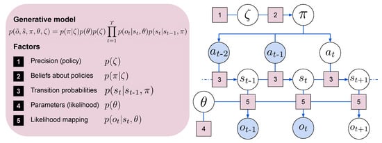 In the remainder of this section, we discuss how the agent’s probabilistic model for perception and action is learned by minimizing free energy, providing a mathematical synthesis. We consider the environment as a partially observable Markov decision process (POMDP), represented in Figure 3. Using subscripts to specify the discrete time steps, we indicate the observation or outcome at time t with . To indicate sequences that span over an undefined number of time steps, we use the superscript ∼, i.e., for outcomes . The succession of states is influenced by sequences of actions, or policies, that we indicate with . Parameterization of the state-outcome likelihood mapping is indicated with . A precision parameter influences action selection working as an inverse temperature over policies.