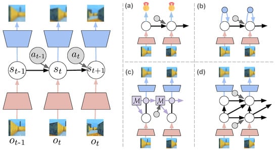 Rather than replacing the likelihood model, some other approaches (c–d) have instead focused on improving the capacity of the model. This is the case of the memory-equipped models (Figure 4c) and hierarchical models (Figure 4d). Using memory allows to preserve more information about other (past) observations, and has shown encouraging results in training latent dynamics models with deep learning memory models, such as LSTMs and GRUs [,,,]. The memory increases the capacity of the model and allows more accurate predictions of states that are far in the future, especially when the prior model is unknown and must be learned.