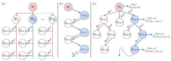 Hybrid Search Policies. Finally, hybrid search schemes (c) combine the use of a learned prior with computing the expected free energy for sequences of actions. The search space is greatly limited by using the prior, which influences the choice of the nodes to select and expand. One of the most popular applications in RL of these methods is by employing variants of Monte Carlo Tree Search (MCTS) [,], which use both a prior over actions and estimates of the expected utility over long horizons, as in Equation (10). Similar approaches have recently been applied for active inference [,]. While these methods are generally applicable only for discrete action spaces, extensions of MCTS for continuous domains have been developed as well []. The precision parameter in these methods can be used to control the influence of the prior relative to the expected free energy (computed a posteriori, with respect to a certain action/plan).