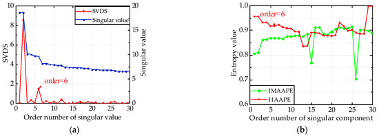 The difference spectrum unilateral maxima of singular value (DSUMSV) determines the effective rank order number by, from right to left, selecting the coordinate value corresponding to the highest difference of the peak compared with its neighbor one. This case adopts the DSUMSV to describe HAAPE’s accuracy of identification. To validate the superiority of the HAAPE algorithm, the IMAAPE algorithm is compared in this case to a related analysis, and the selection of parameters (N, m, τ, A, k) refers to those presented in Section 2.3.