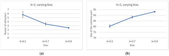 By increasing the bias, the distribution of the number of pseudo-attractors also varies, leading to systems with a smaller average number of attractors (Figure 7a). At the same time, the common part grows in size (Figure 7b), it is composed by less WCCs (Figure 8), and it is composed of less and less oscillating nodes—Figure 7c,d.