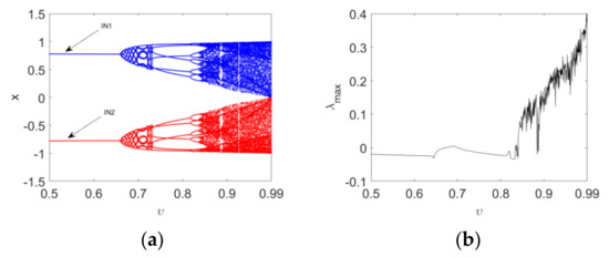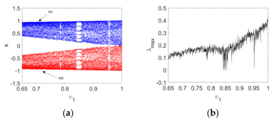 Figure 6. Bifurcation diagrams and maximum Lyapunov spectrum of Map (15) as the order υ 1 varies: (a) the bifurcation diagrams with IN 1 and IN 2 ; (b) the corresponding maximum Lyapunov spectrum.