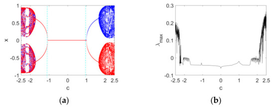 Secondly, the order υ = 0.95 is fixed and the bifurcation diagrams and maximum Lyapunov exponent spectrum versus c with IN 1 and IN 2 are plotted in Figure 3. From Figure 3a we can see that a positive solution branch (blue) in the bifurcation diagram is corresponding to the positive initial condition IN 1 , while a negative solution branch (red) is corresponding to the negative initial condition IN 2 . The map stabilizes at the equilibrium point E 1 when 1 c < 1 . A typical symmetry-breaking bifurcation occurs when c = 1 . The maximum Lyapunov exponent spectrum in Figure 3b, showing certain chaotic and periodic features, is consistent with the bifurcation diagrams in Figure 3a. Here, the maximum Lyapunov exponent is computed based on the Jacobian matrix algorithm for discrete fractional maps [45].