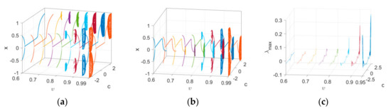 Thirdly, the dynamics of the map with the variation in both c and υ is studied. The change in the range of c is 2.5 c 2.5 , and that of the order υ is 0.6 υ 0.99 . The corresponding bifurcation diagrams and maximum Lyapunov exponent spectrums in three-dimensional space are depicted in Figure 4 with IN 1 and IN 2 . From Figure 4a,b, it can be seen that the dynamics of Map (10) with the variation in c becomes regular as υ decreases to 0.6, and complex as υ increases to 0.99. The qualitative behavior of the map can be reflected by the maximum Lyapunov exponent spectrums in Figure 4c.