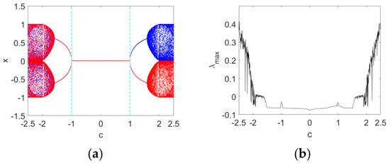 Figure 3. Bifurcation diagrams and maximum Lyapunov spectrum of Map (10) as the parameter c varies when υ = 0.95 : (a) the bifurcation diagrams with IN 1 and IN 2 ; (b) the corresponding maximum Lyapunov spectrum. Blue and red diagrams are produced with the initial conditions IN 1 and IN 2 , respectively.