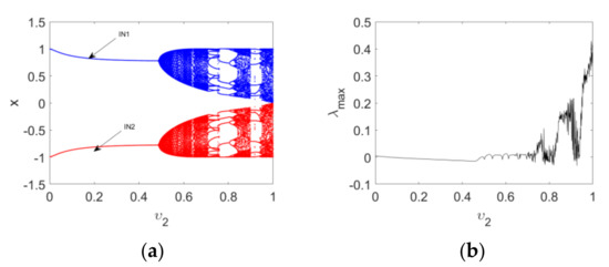 Figure 7. Bifurcation diagrams and maximum Lyapunov spectrum of Map (15) as the order υ 2 varies: (a) the bifurcation diagrams with IN 1 and IN 2 ; (b) the corresponding maximum Lyapunov spectrum.