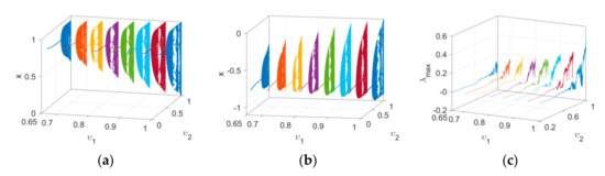Figure 8. Bifurcation diagrams and maximum Lyapunov exponent spectrums in a three-dimensional space with different initial values as υ 1 and υ 2 vary: (a) the bifurcation diagram with IN 1 ; (b) the bifurcation diagram with IN 2 ; (c) the corresponding maximum Lyapunov exponent spectrums.