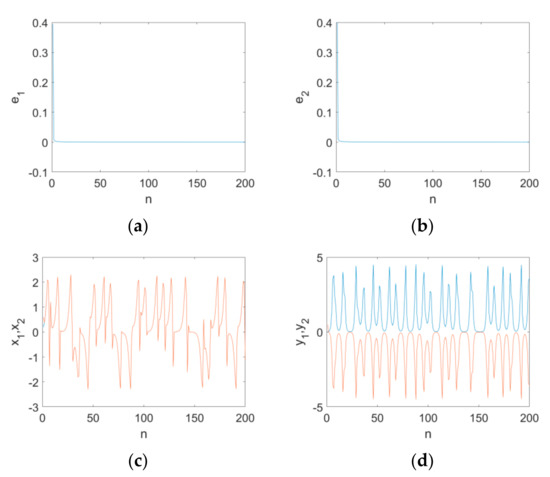 Figure 9. The simulation results for the synchronization of the map when υ = 0.98 with the variation in n : (a) the error state variable e 1 ; (b) the error state variable e 2 ; (c) the state variables x 1 , x 2 ; (d) the state variables y 1 , y 2 .