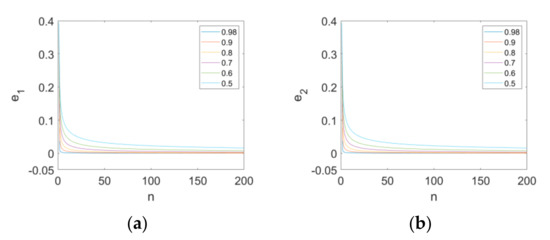 Figure 10. The error state variables of synchronization with different values of order: (a) the error state variable e 1 ; (b) the error state variable e 2 .