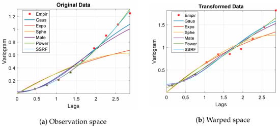 The empirical variograms for both the sample (in observation space) and its counterpart in the warped space are shown in Figure 1. Note that the spherical and exponential models, which imply continuous but non-differentiable stationary processes, provide poor fits for the empirical variogram (shown by markers), especially in the observation space. This is due to the fact that the true process is a differentiable function mixed with noise. All the other models tested provide reasonable fits to the empirical variograms (with the inclusion of a small discontinuity term at the origin which reflects the noise). Remarkably, the power-law model () which corresponds to a non-stationary, continuous but non-differentiable process also gives a good fit. The best fit for the empirical variograms is provided by the Spartan model given by Equation (A4). In one dimension, the Spartan covariance model represents the covariance function of a damped linear harmonic oscillator driven by white noise [], (Chapter 9). Hence, it is a suitable candidate for the oscillatory observation process defined by Equation (16).